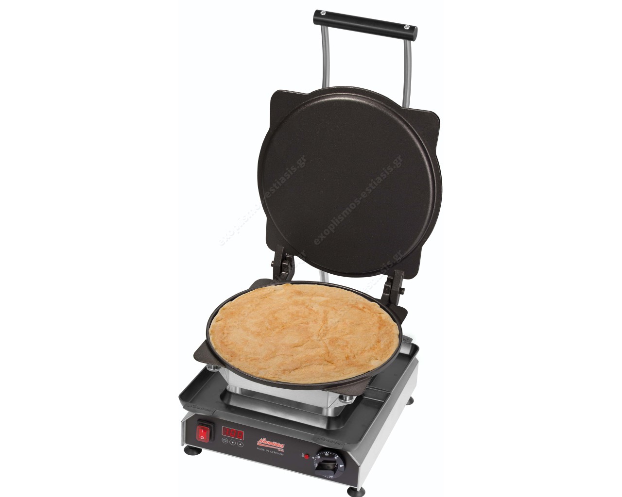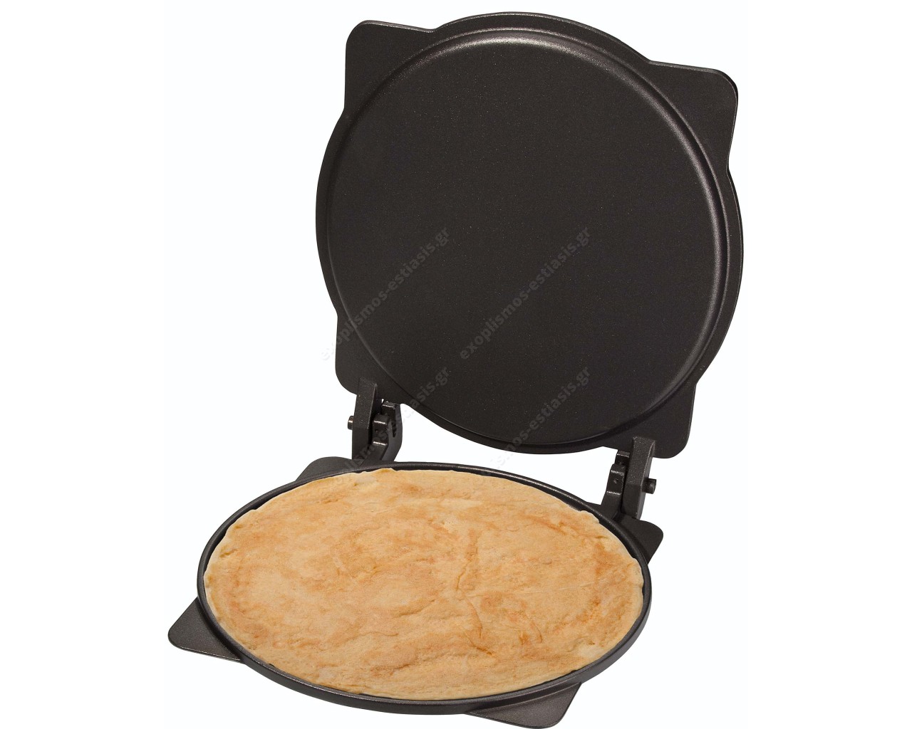 - Λόγω της επαφής με την πάνω πλάκα, το μείγμα απλώνεται από μόνο του, ομοιόμορφα πάνω στην επιφάνεια ψησίματος, χωρίς να χρειάζεται γύρισμα