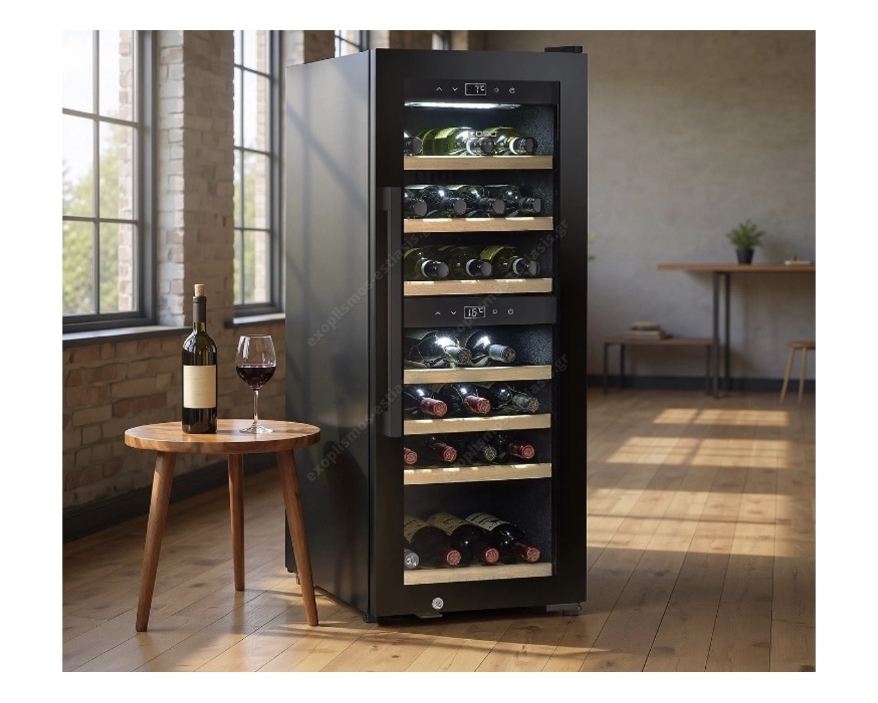 - Δύο ξεχωριστές ζώνες θερμοκρασίας για λευκό και κόκκινο κρασί, ρυθμιζόμενες ξεχωριστά μέσω αισθητήρα αφής
