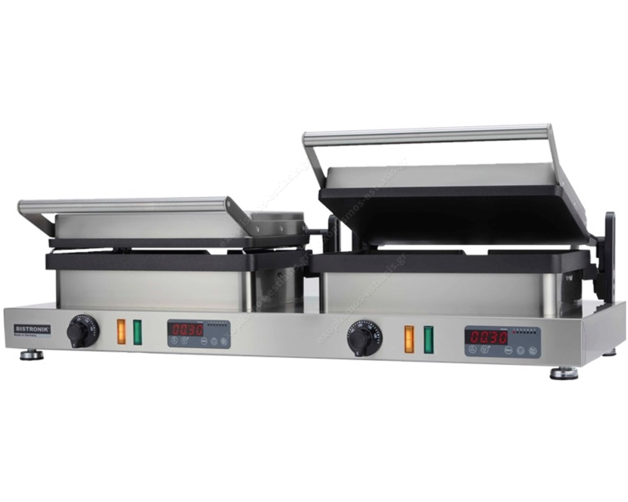 Τοστιέρα διπλή MULTIGRILL E-400 BISTRONIK. Τα multigrill BISTRONIK κατασκευάζονται στη Γερμανία και αποτελούν το απαραίτητο εργαλείο κάθε επαγγελματία που δραστηριοποιείται στο χώρο της εστίασης. Ψήνουν σε απίστευτους χρόνους και με ξεχωριστή ποιότητα, αξιοποιώντας και τις δύο θερμαινόμενες πλάκες. Καλύπτουν με μεγάλη ευκολία κάθε ανάγκη σε πρωινά και brunch (ομελέτες, αυγά μάτια, pancakes, μπέικον κτλ.), σε σνακ (τοστ, σάντουιτς, κλαμπ σάντουιτς, κρέπες, burger κτλ.), σε μερίδες (μπριζόλες, φιλέτα, μπιφτέκια, σουβλάκια, σνίτσελ κτλ) καθώς και σε θαλασσινά και ψάρια (γαρίδες, χταπόδι, φιλέτα ψαριού, ψάρι μερίδας κτλ.). Παράλληλα έχουν τη δυνατότητα να ψήνουν κατευθείαν τα κατεψυγμένα προϊόντα χωρίς ξεπάγωμα.